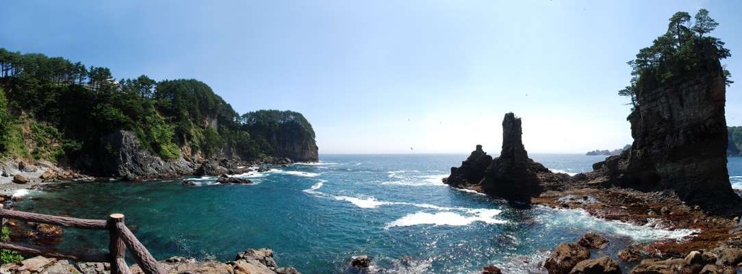 岩手県 田老 三陸海岸の名勝 山王岩 駐車場から長い階段を降りると山王岩を目の前に見ることが出来る。海の色、周囲の断崖の見事さが3つの岩の印象を際だたせてくれる 縦撮影17枚つなぎ写真 360度がいつまでも続きます。 ボタンで戻って下さい