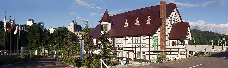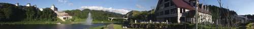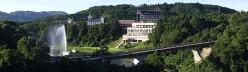 左にパークホテル、胎内川と大噴水、右は胎内高原ビール園。この中心の胎内エリア以外にも自然豊かなキャンプ場、クアハウス等の施設がある |