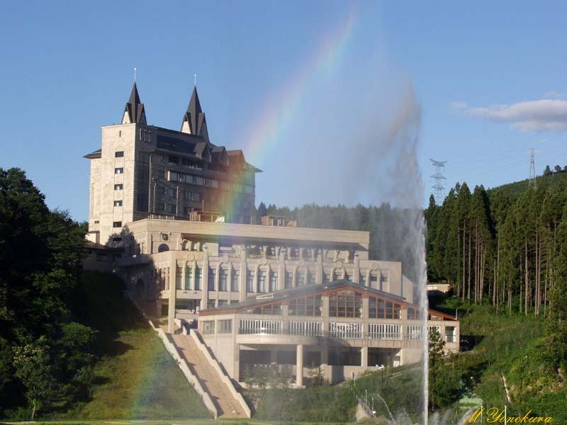 新潟県新発田市の北東にあり、ホテルや運動・レクリエーション施設がある地域。胎内川の中央に大噴水があり、ロイヤルパークホテルのお城のような外観とマッチしている |