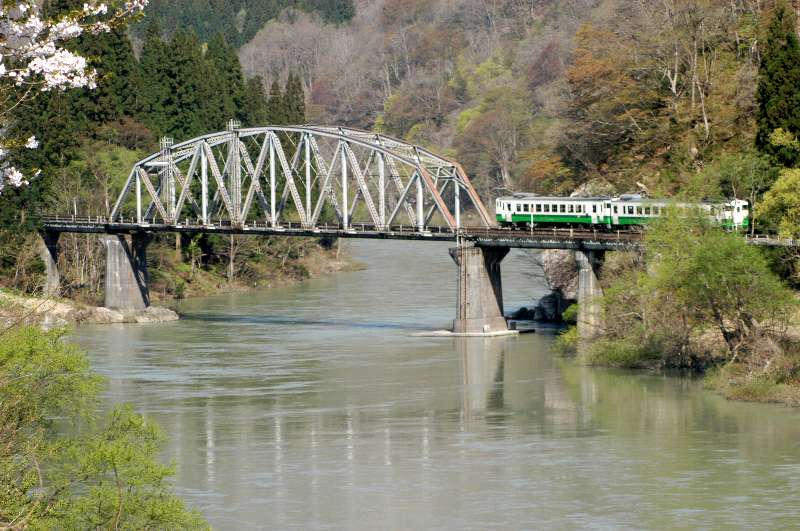 只見川を渡る只見線の列車 2005.5訪問時 まだ山桜が咲いていた