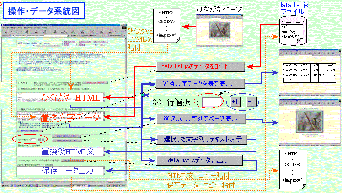 次の2つの窓 (1) 定型のHTML文 および (2) 置換文字データ に入力されたデータを data_list.js ファイル